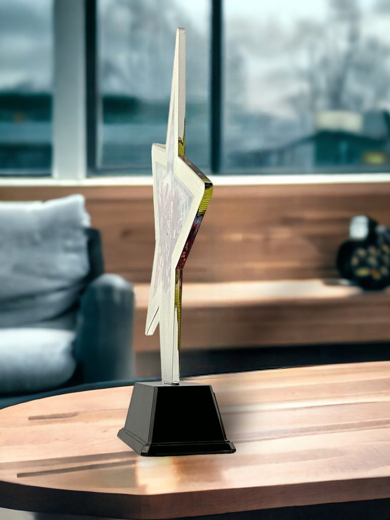 Akrylátová trofej s UV potiskem. Jednostranný tisk. V ceně trofeje není zahrnuta cena štítku. Akrylátový motiv. Tloušťka 0.4 cm.Podstavec černý. Výšky trofejí jsou orientační.