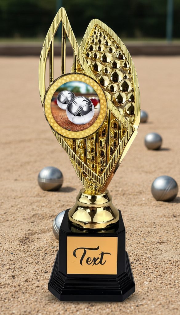 Stylová trofej v barvách zlato, stříbro nebo bronz, výška 31 cm. Designový emblém se sportovním motivem v nejvyšší kvalitě tisku s lakem. Možnost doplnění štítku dle vaší volby.