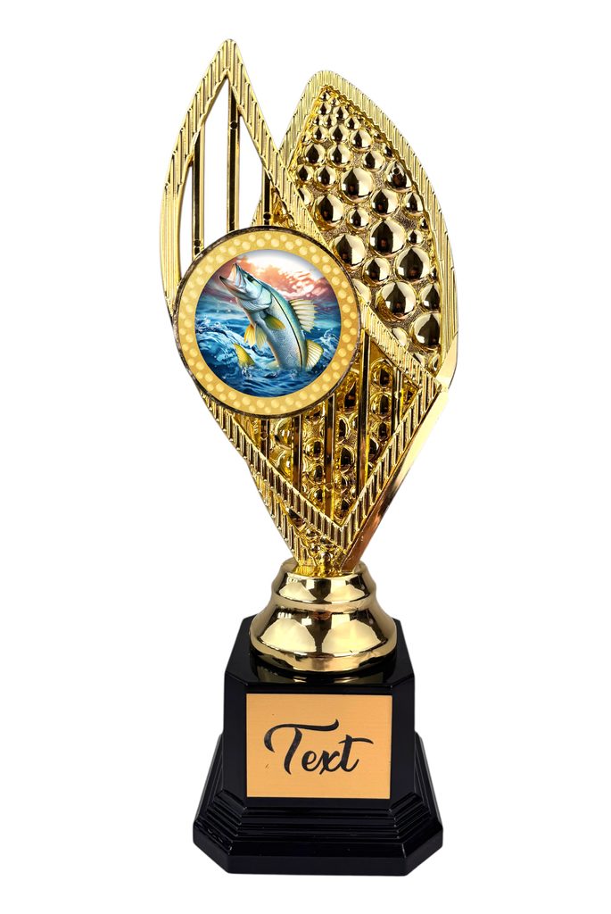 Stylová trofej v barvách zlato, stříbro nebo bronz, výška 31 cm. Designový emblém se sportovním motivem v nejvyšší kvalitě tisku s lakem. Možnost doplnění štítku dle vaší volby.