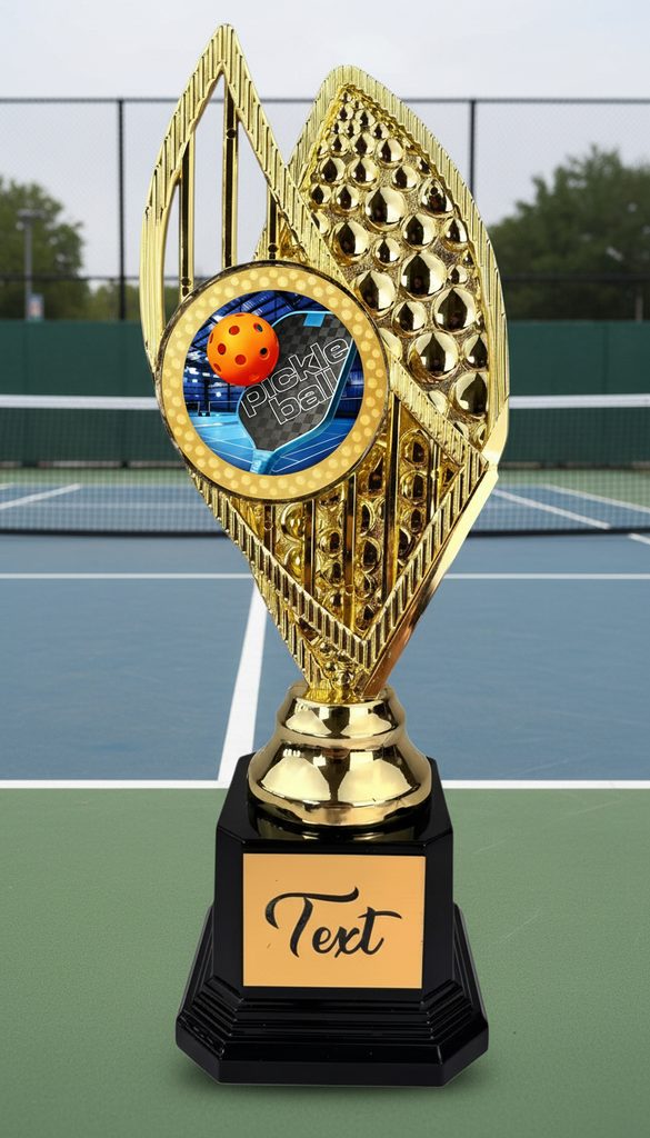 Stylová trofej v barvách zlato, stříbro nebo bronz, výška 31 cm. Designový emblém se sportovním motivem v nejvyšší kvalitě tisku s lakem. Možnost doplnění štítku dle vaší volby.