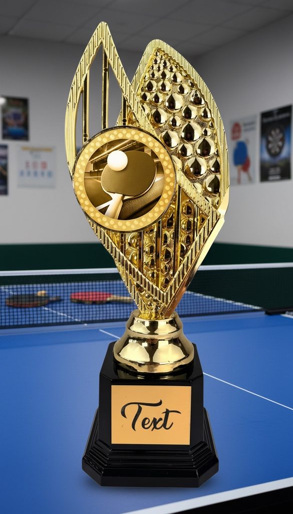 Stylová trofej v barvách zlato, stříbro nebo bronz, výška 31 cm. Designový emblém se sportovním motivem v nejvyšší kvalitě tisku s lakem. Možnost doplnění štítku dle vaší volby.