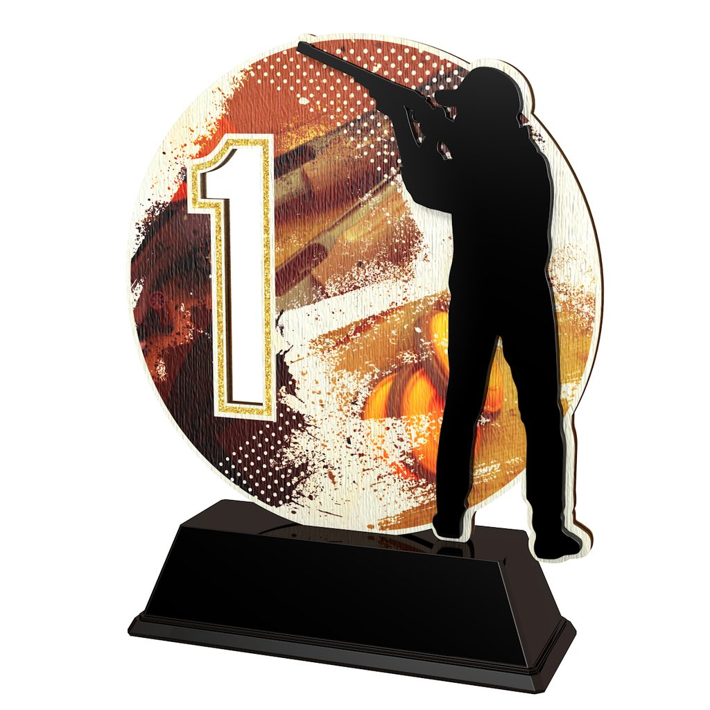 Dřevěná trofej s černým plastovým podstavcem, UV potiskem a siluetou z černého lesklého akrylátu. V ceně trofeje není zahrnuta cena štítku. Štítek vyberete v následujícím kroku, po vámi zvolené velikosti trofeje a barvy.