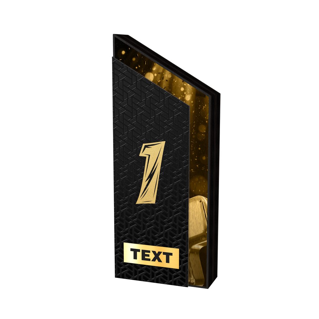 Elegantní sportovní trofej vyrobená z kvalitního dřeva doplněná precizně vyřezaným nerezovým prvkem o tloušťce 2 mm. Moderní vrstvený design vytváří zajímavý prostorový efekt a dodává trofeji reprezentativní vzhled vhodný pro sportovní soutěže a turnaje.