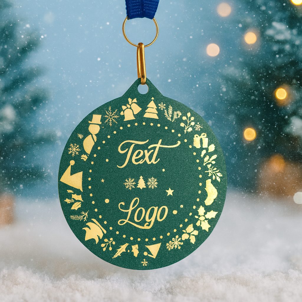 Kovová Vánoční medaile o tloušťce 0,15 mm s možností vložení vlastního textu i loga na přední i zadní stranu. Medaile se vyrábí ve 3 velikostech – 5, 6 a 7 cm. Stuha je ke každé medaili zdarma.
