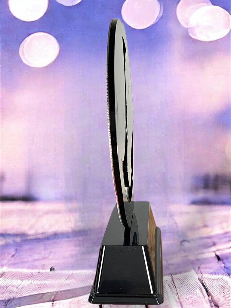 Elegantní kovová trofej kombinovaná s černým akrylátem. V ceně trofeje není zahrnuta cena štítku. Tloušťka trofeje je 0,4 cm. Podstavec je černý.