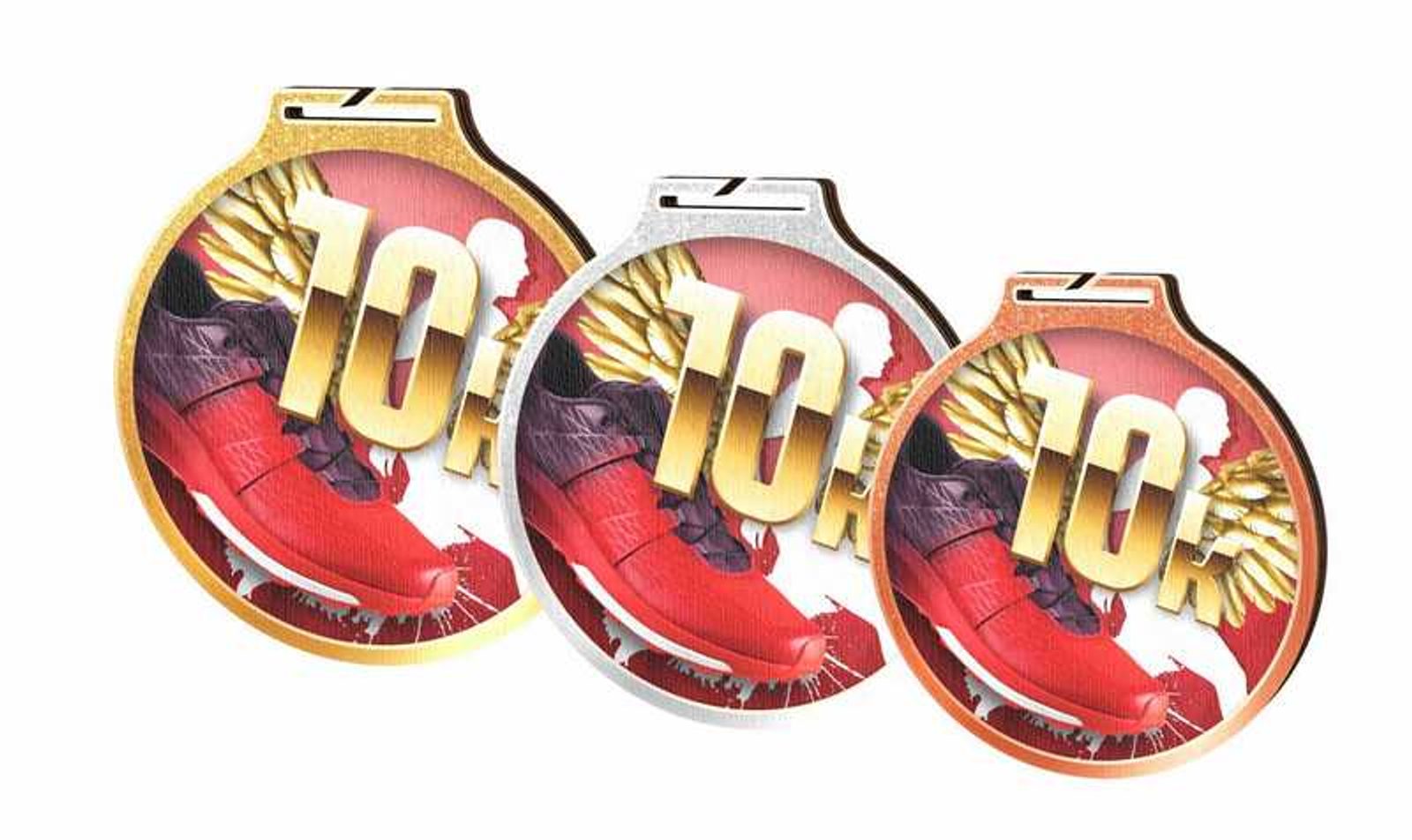 Dřevěná medaile s potiskem, možnost nalepení štítku ze zadní strany (barevný tisk) nebo potisku (tisk v bílé barvě). Cena včetně stuhy.