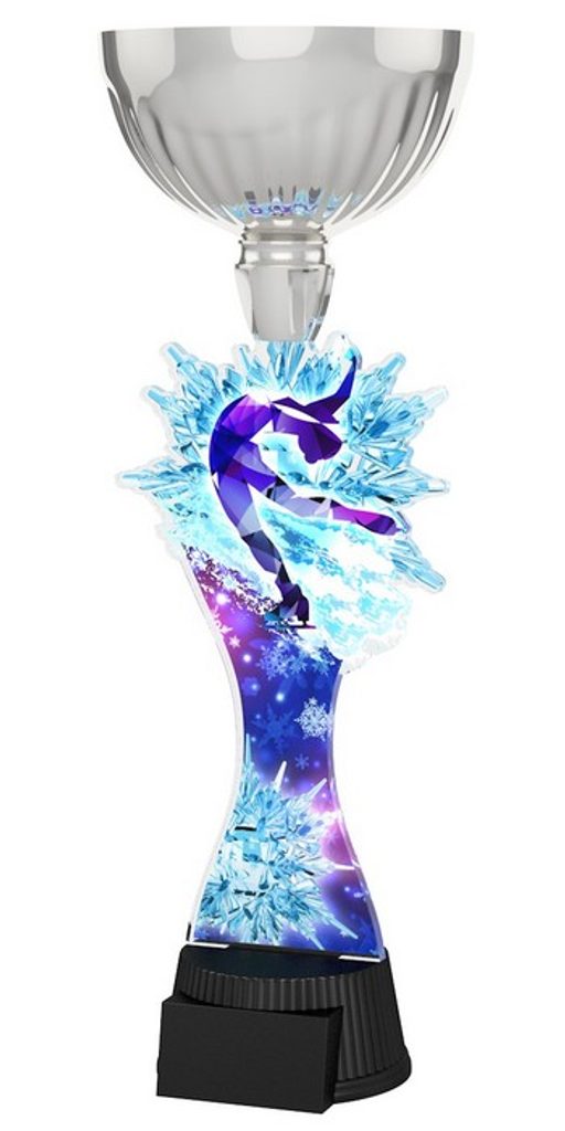 Akrylátová trofej. V ceně trofeje není zahrnuta cena štítku. Akrylátový motiv 0.6 cm. Stříbrný kalich. Výšky trofejí jsou orientační. Oboustranný tisk.