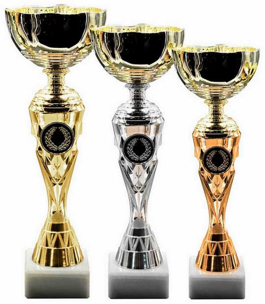 Na pohár lze umístit emblém. V ceně poháru není zahrnuta cena štítku. Zlatý pohár 30cm, stříbrný pohár 27,5cm, bronzový pohár 24,5cm.