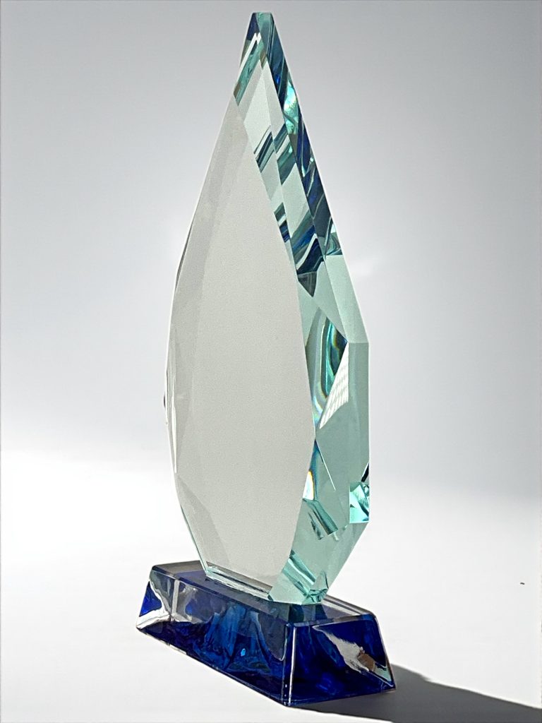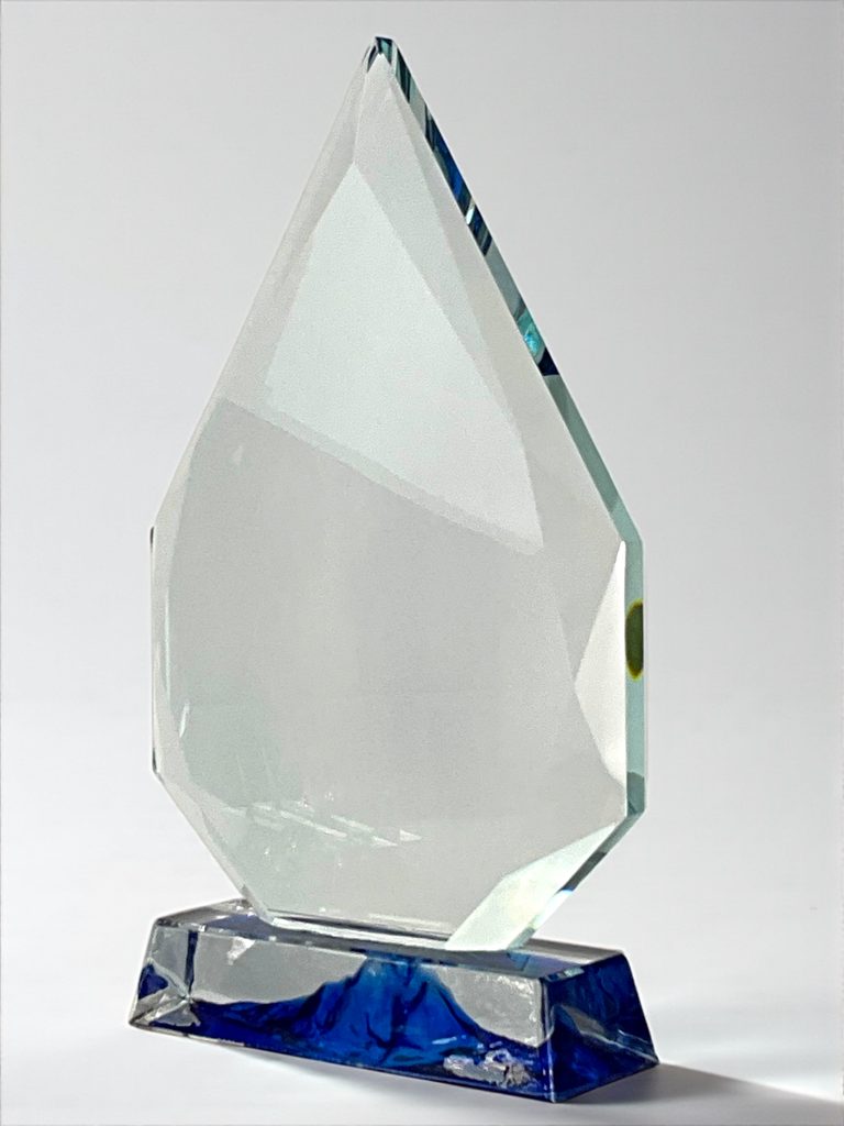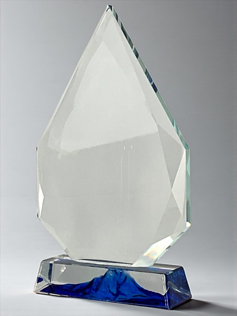Elegantní skleněná trofej ve tvaru vrcholu s tloušťkou skla 1,5 cm a stylovou modrou základnou. Ideální pro ocenění úspěchů, personalizovatelná dle vašeho přání.