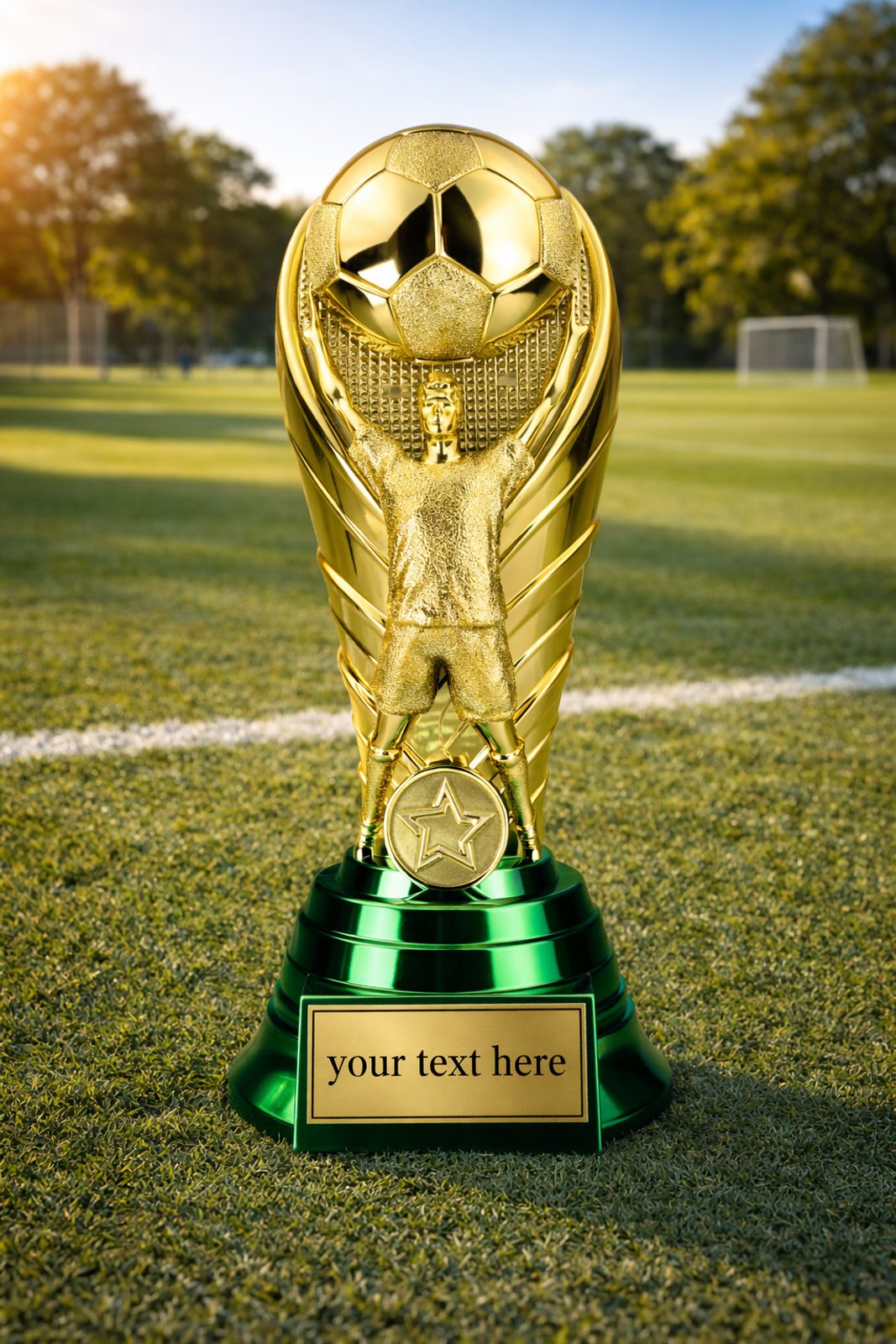 Výrazná a nepřehlédnutelná fotbalová trofej s luxusním zlatým povrchem a kvalitním zpracováním. Je vyrobena z odolného plastu a doplněna stabilním zeleným podstavcem, díky čemuž se skvěle hodí pro turnaje, ligové soutěže i týmová ocenění.